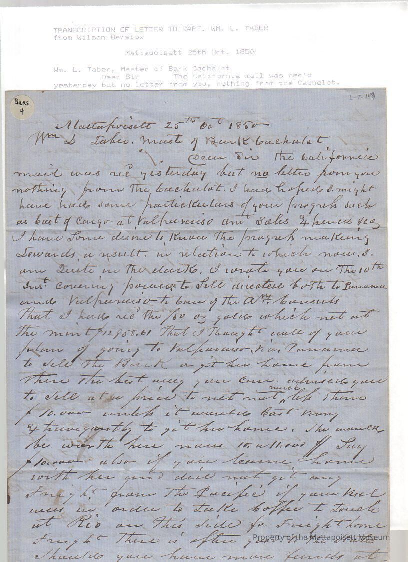 Letter to Capt. William L. Taber on Bark Cachelot from Wilson Barstow in Mattapoisett. Transcription.Collection