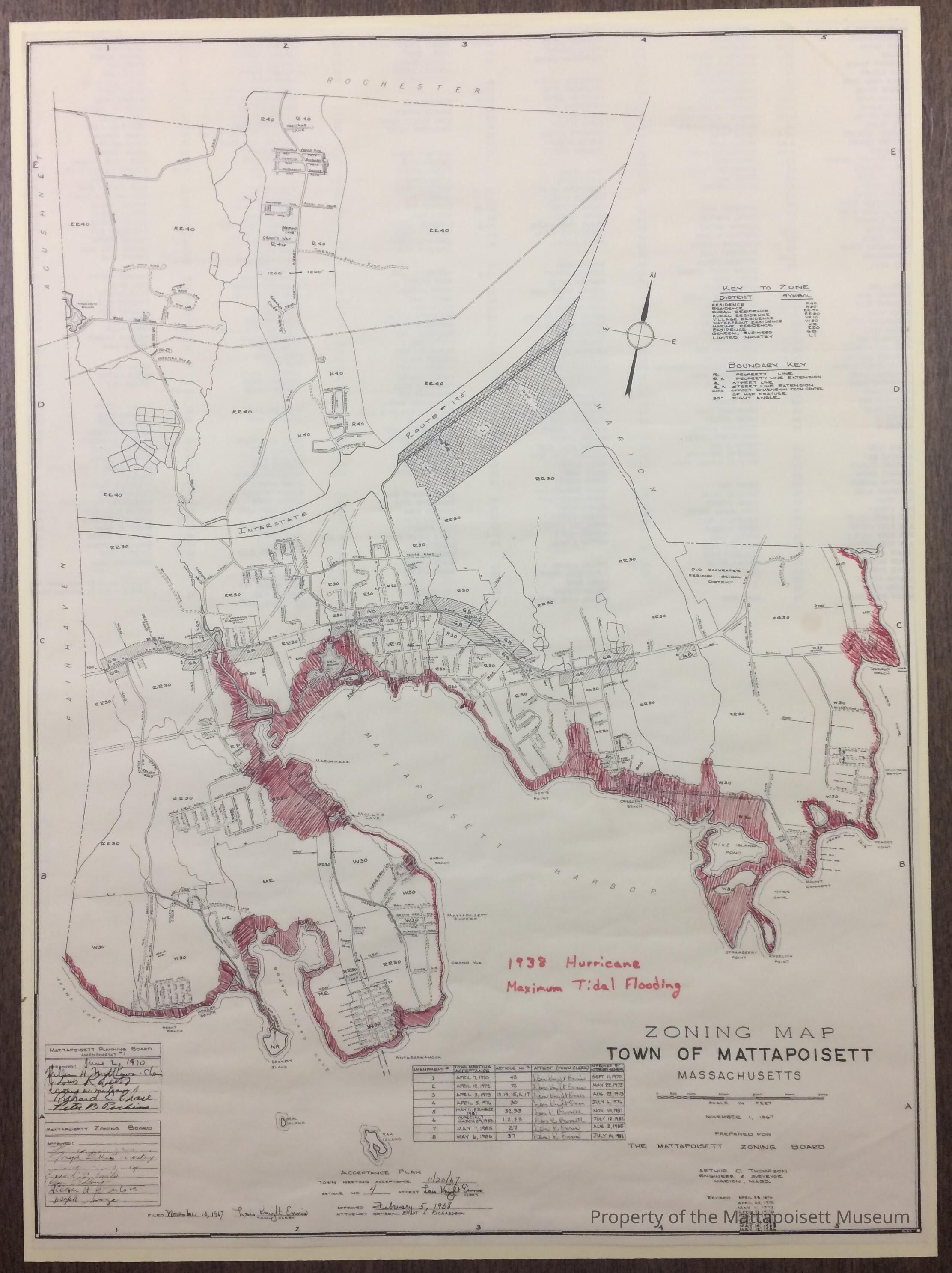 Zoning map of Mattapoisett, created in 1968 and last updated 1986. Annotated in red to show the extent of the flooding during the 1938 hurricane.Collection
