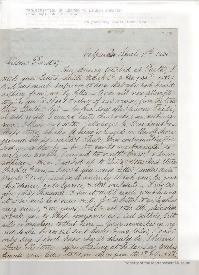 Letter to Wilson Barstow from Capt. William L. Taber. Transcription.Collection