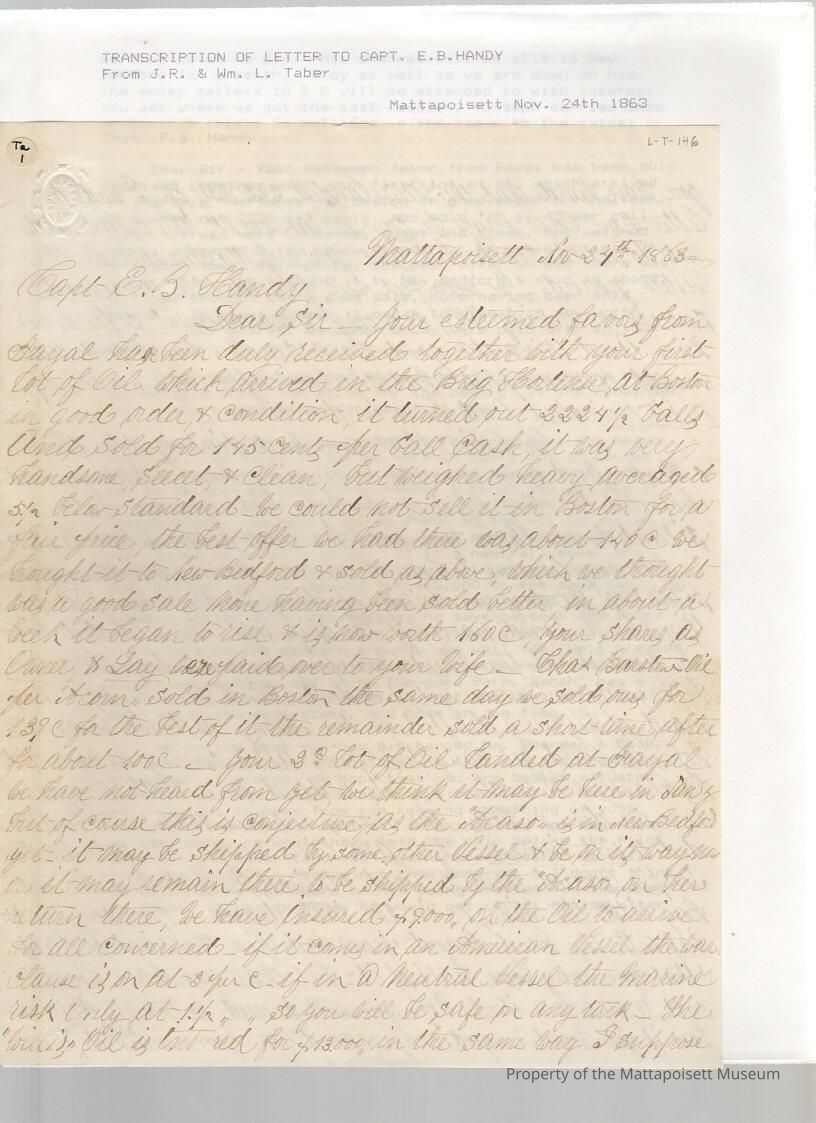 Letter to Capt. E. B. Handy from J.R. & William L. Taber. Transcription.Collection