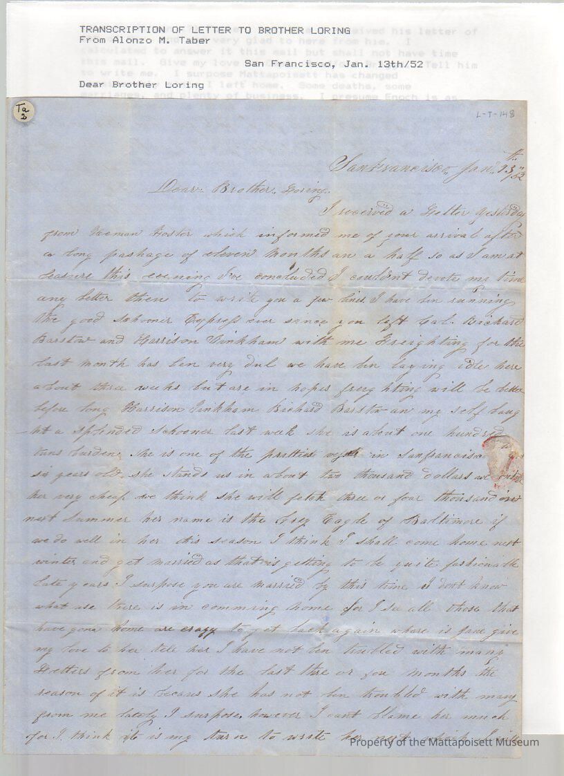 Letter to "Brother Loring" [Capt. William L. Taber] from Alonzo M. Taber in San Francisco. Transcription.Collection