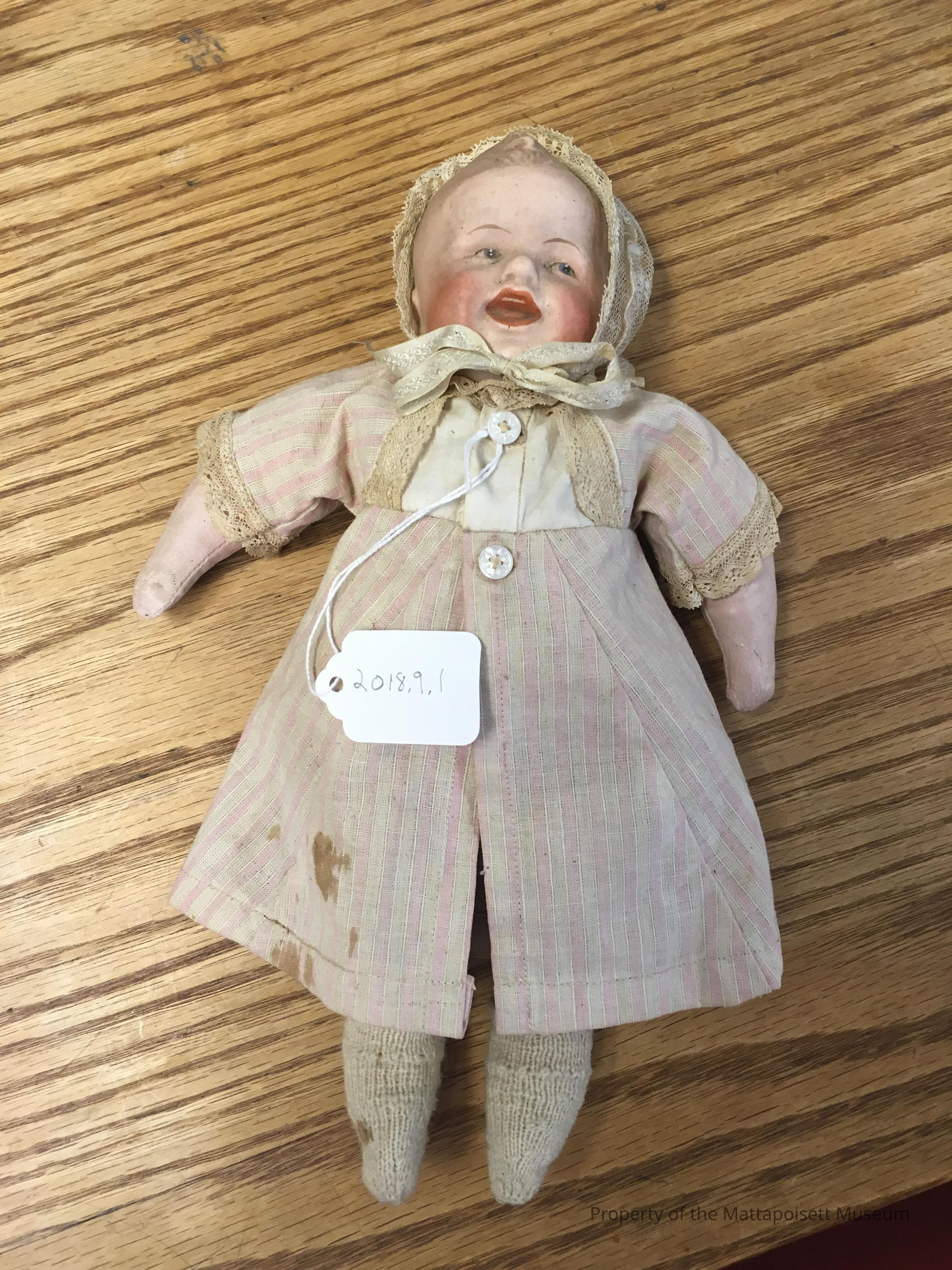 Handmade doll and clothes, approx. 10" long. Made in Mattapoisett c. 1907 for Edna Harvey Dexter by her grandmother Mrs. Samuel T. Bennett. Head was purchased, manufacturer unknown. The doll's name is Happy.Collection