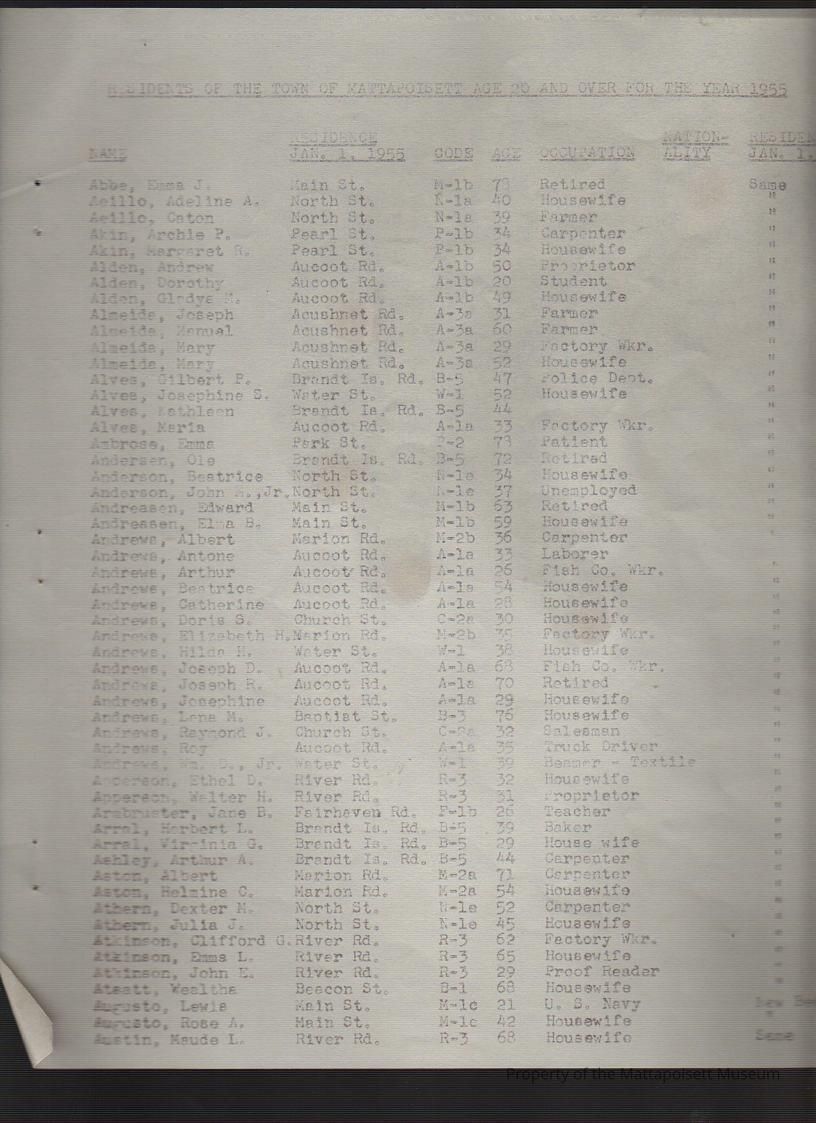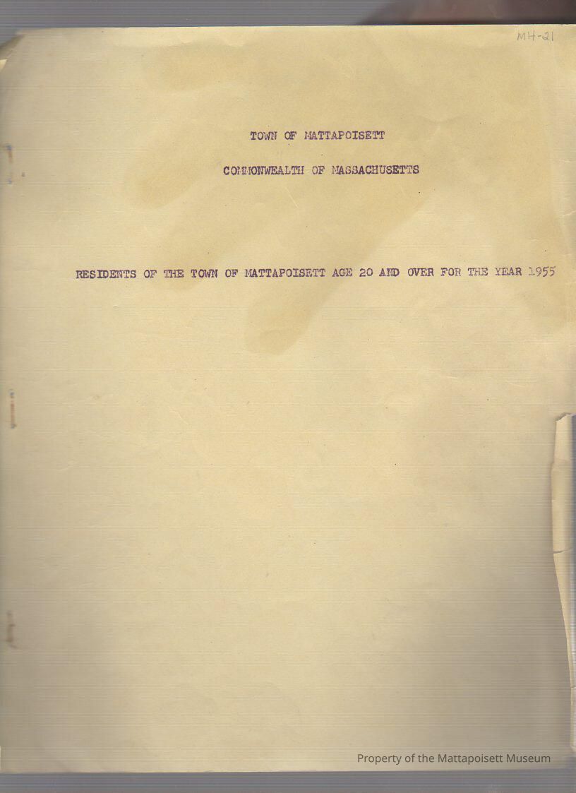 Town of Mattapoisett residents of the town of Mattapoisett age 20 and over for the year 1955.Collection