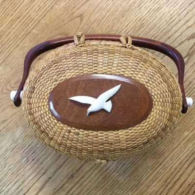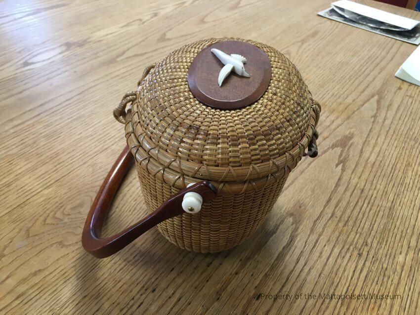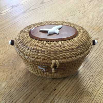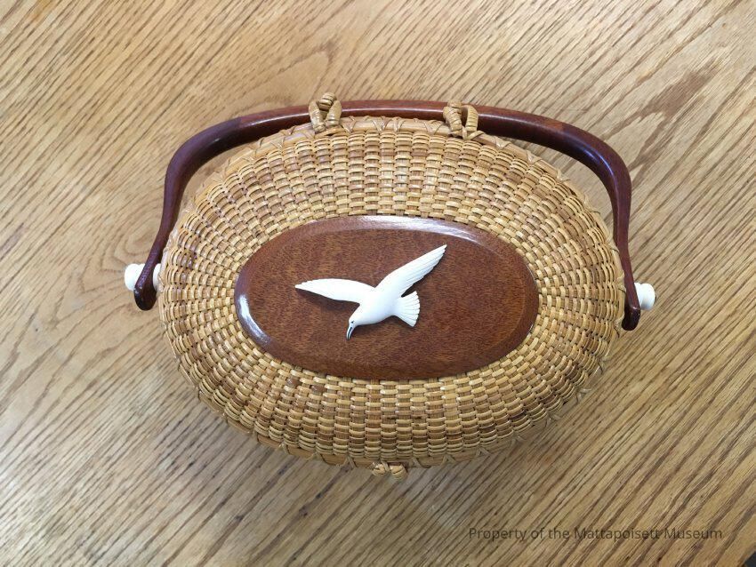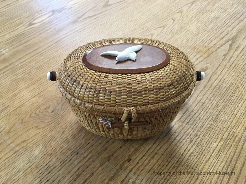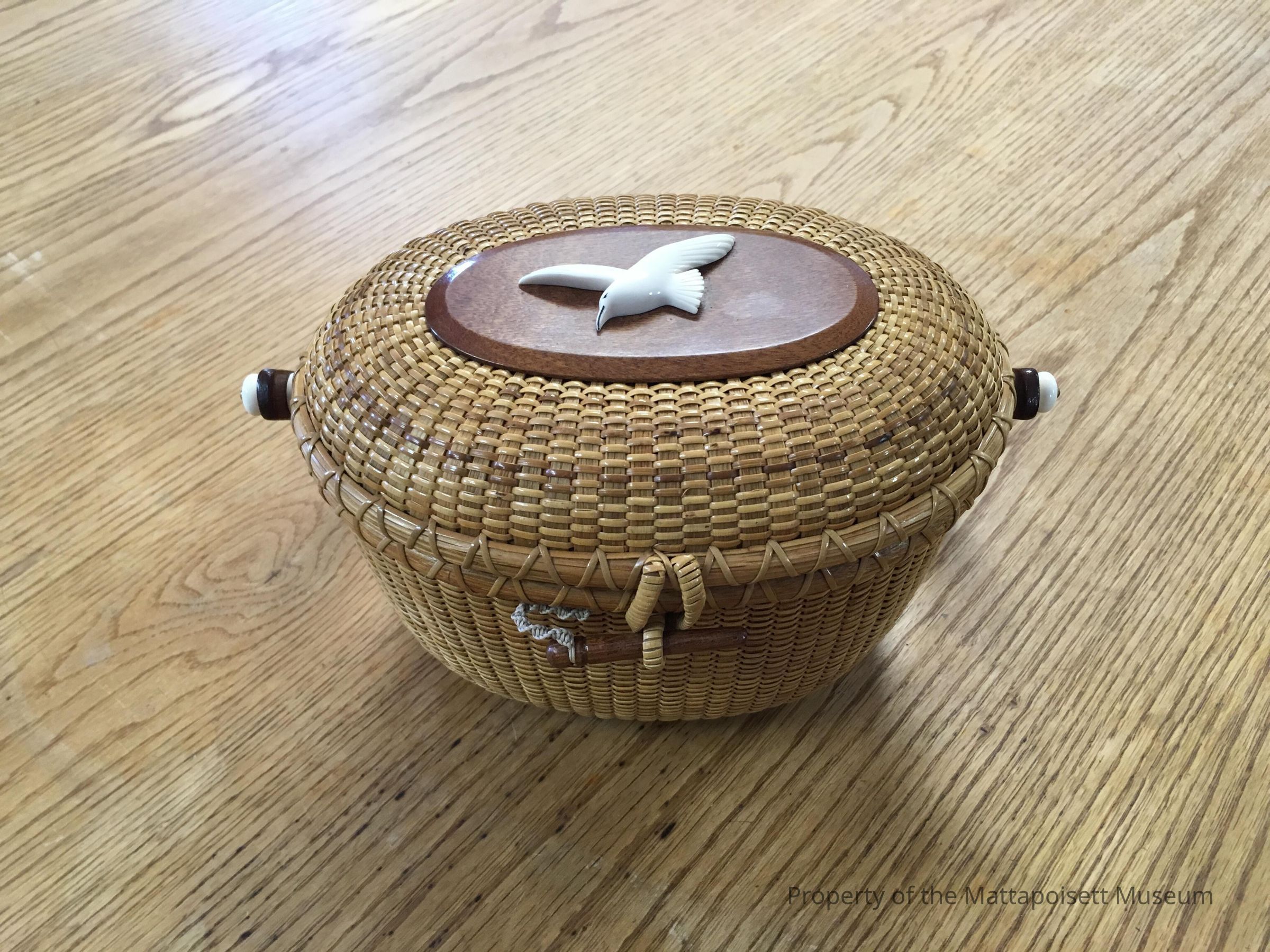 A Nantucket style basket with a seagull decoration on the lid. Made by Susan McGowan, c. 1995.Collection