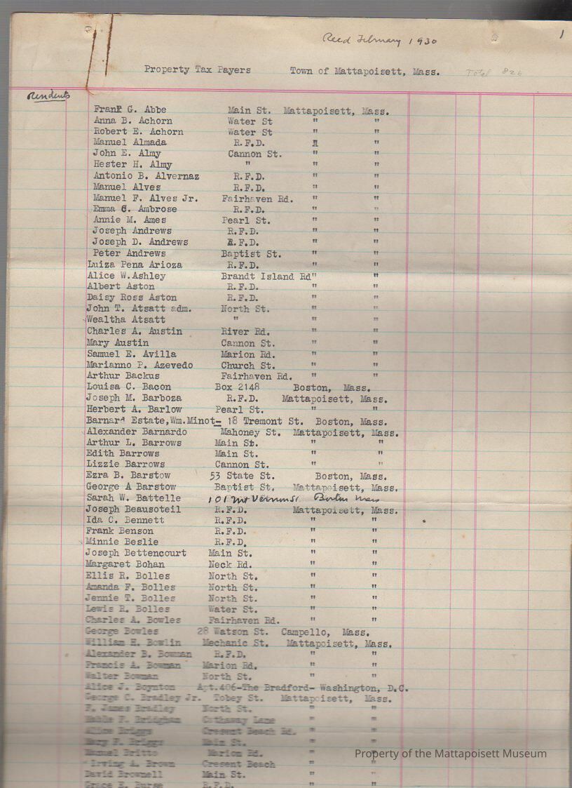 Property tax payers, Town of Mattapoisett, Mass. from Lester A. Crampton, SelectmanCollection