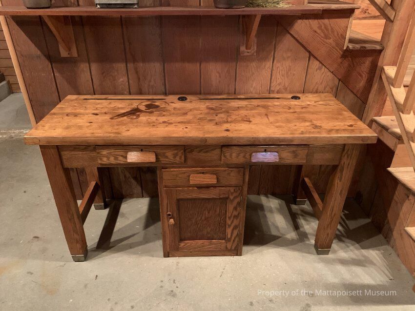 Oak two-student desk from Mattapoisett Center School. May date from original construction of school, c. 1898. Approx 60" long.Collection