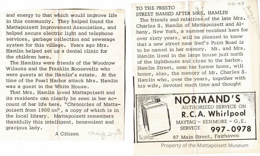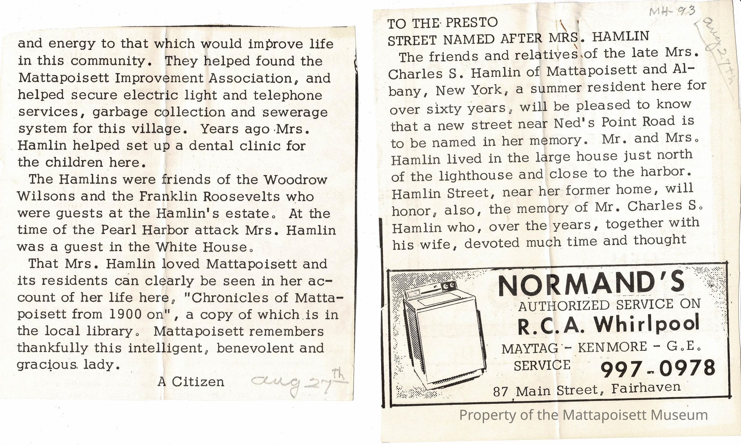 Article in Presto Press, "Street named after Mrs. Hamlin".Collection