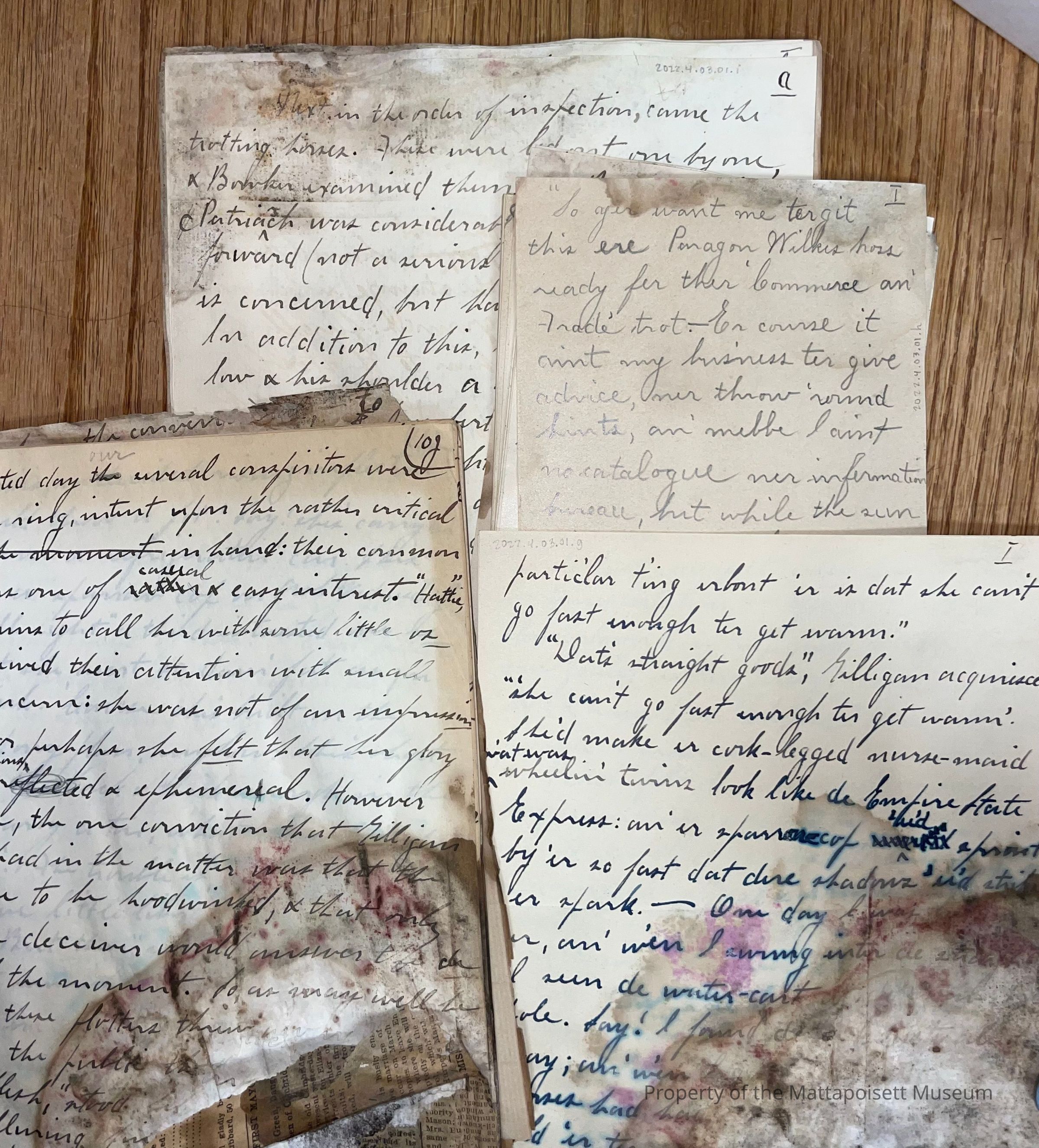 Everything in the collection (letters, manuscripts, typewriter, wedding dress, documents, books) was found in the attic of 18 Pine Island Road, Mattapoisett in 2022 and donated by the new house owners. This house was owned by Harrington and his wife. They subdivided the land and created Winnatuxett Beach Rd. George and Marian Harrington were the first couple ever married in St. Philips Church on Water Street. They were married in 1898.