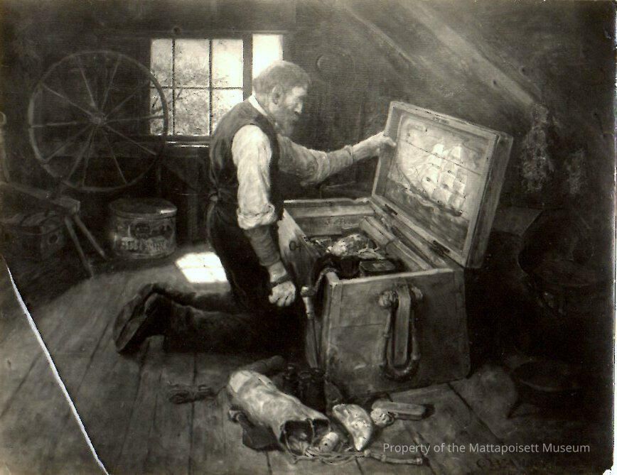 Photograph of a Clifford W. Ashley painting of a man at a footlocker entitled "The Sea Chest". Footlocker has painting of ship and whaling items inside. Initials in the box "J. R." 34x44", 1910. Subject picture for "Scribner's Magazine", November 1912, Clifford W. Ashley collection.Acquisition