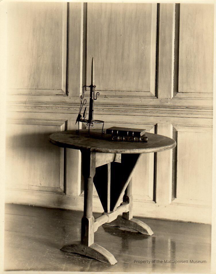 Photograph inside Hinsdale House of a table with books and an intricate candlestick. Two copies.Acquisition
