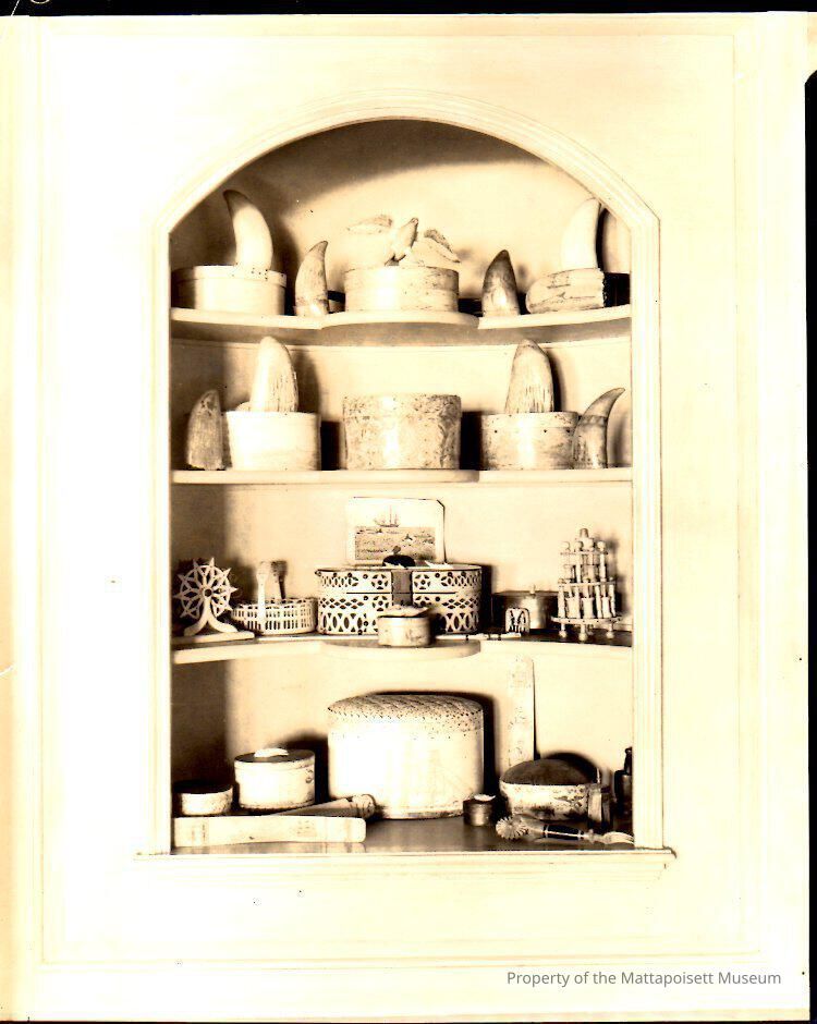 Hinsdale House dining room. 20 Water Street, Mattapoisett, Mass. Corner cupboard of various scrimshaw items, whale teeth, boxes, sewing and cooking equipment.Acquisition