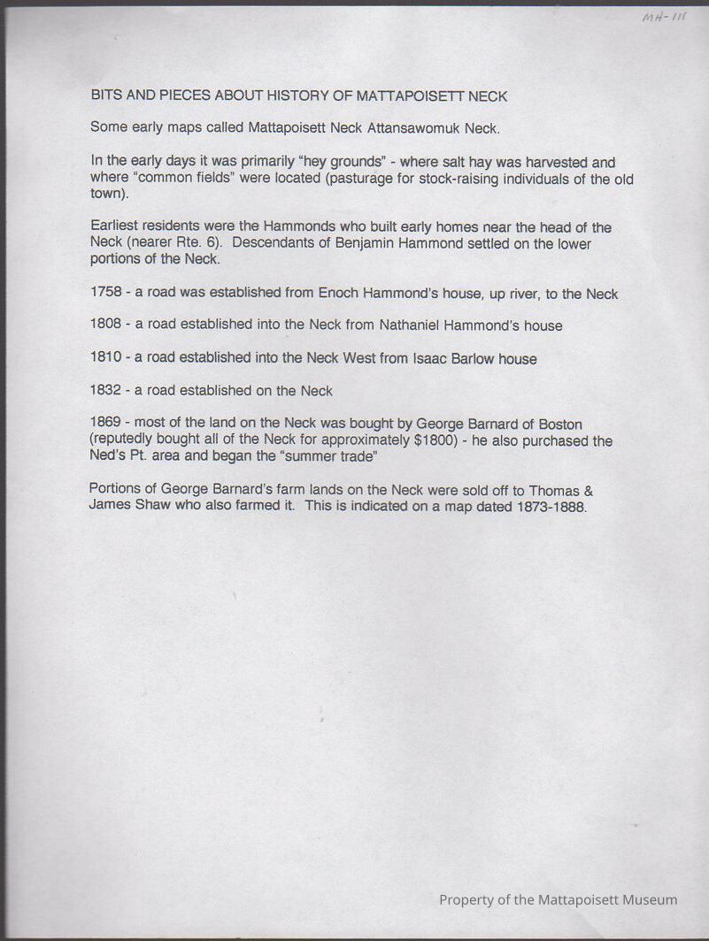 Bits and Pieces about hsitory of Mattapoisett Neck - salt hay and pasturage. Hammonds as early residents.Collection