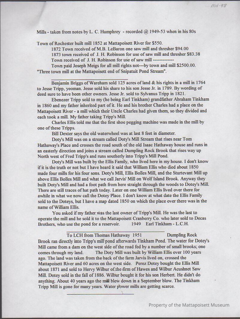 "Mills" write-up taken from notes by L. C. Humphrey, recorded during 1949-1953 while he was in his 80's.Collection