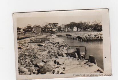 Small photograph of Town Wharf after Hurricane of 1938. Labeled on back "the wharf"Acquisition