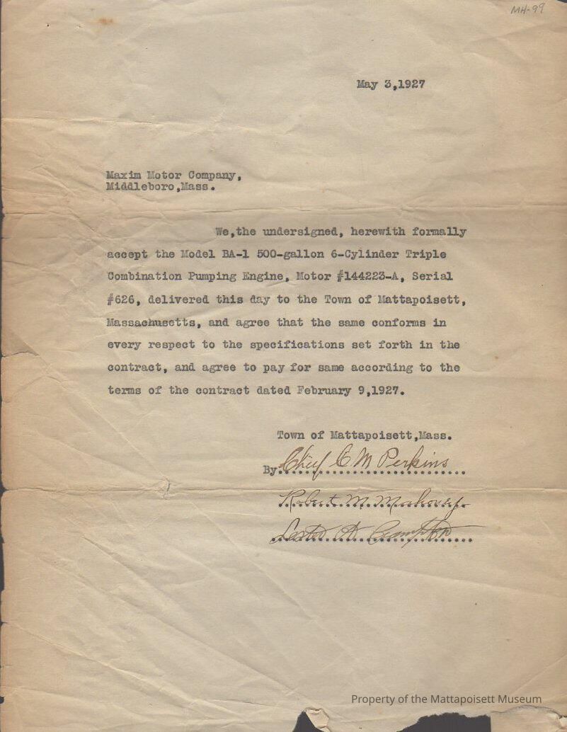 Letter to Maxim Motor Company formally accepting "the Model BA-1 500-gallon 6-cylinder Triple Combination Pumping Engine" from Chief C. M. Perkins, Robert M. Mahoney, Lester A. Crompton.Collection
