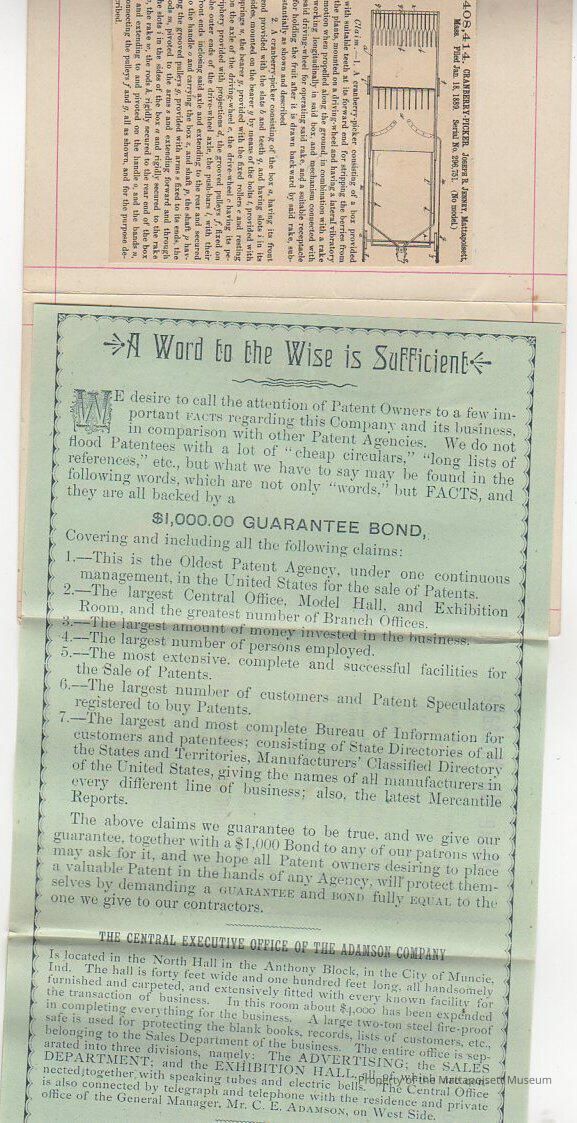 Advertising papers for the Central Executive Office of the Adamson Company for patent registration. Write-up for patent 408,414, Cranberry-picker, Joseph R. Jenney, filed January 18, 1859.Collection
