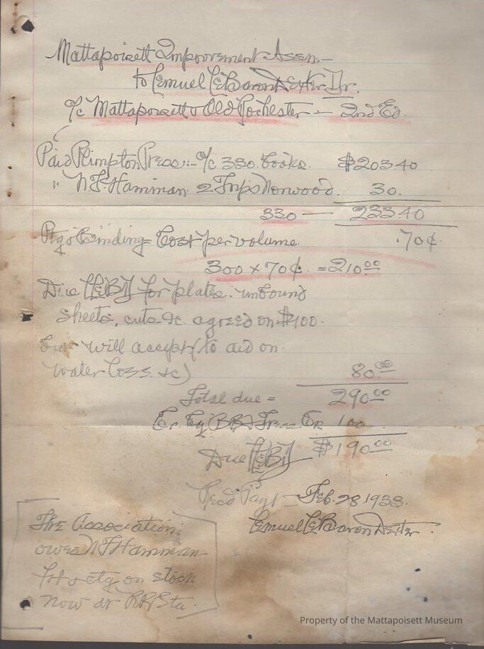Receipt for Mattapoisett Improvement Association payment to Lemuel LeBaron Dexter for books, transportation, plates, sheets, etc.Collection