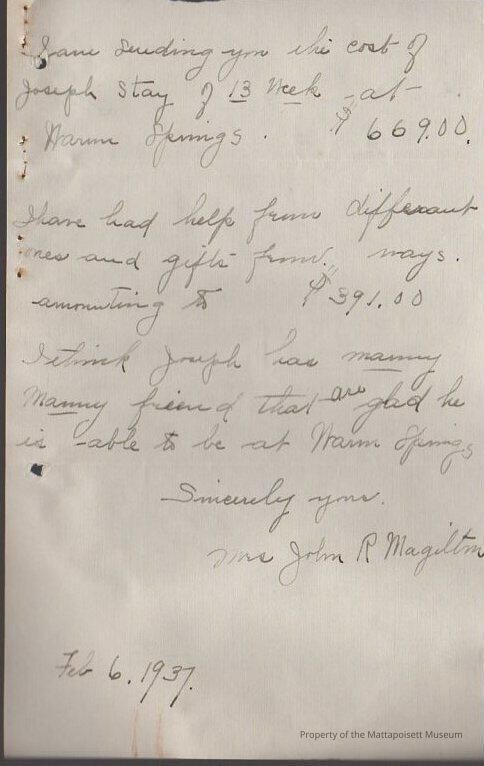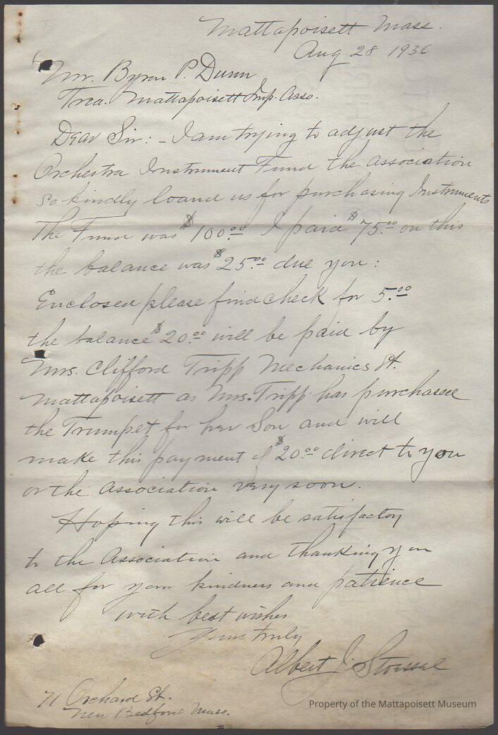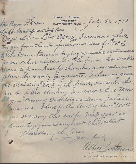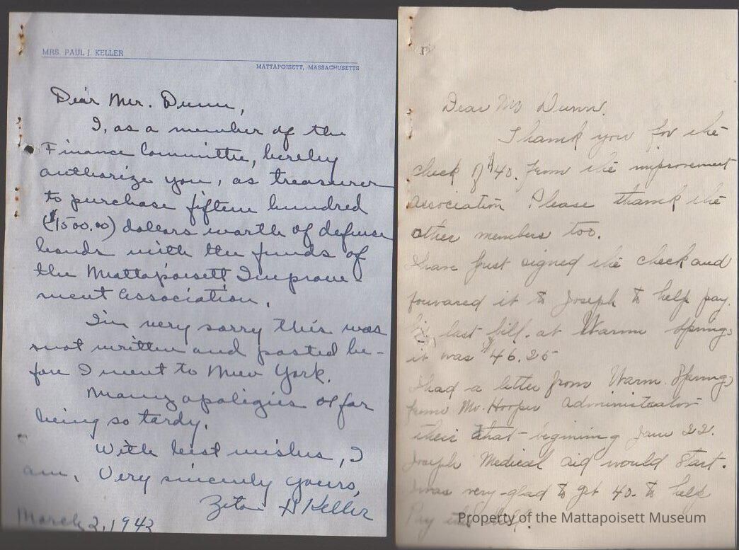 Letters to Byron P. Dunn, Treasurer Mattapoisett Improvement Association from Albert J. Stoessel regarding money from Improvement Association for orchestral instruments. From Zeta H. Keller to purchase defense bonds ($1,500). Thank you for $40 for Warm Springs, from Mrs John R. [Magiltm].Collection