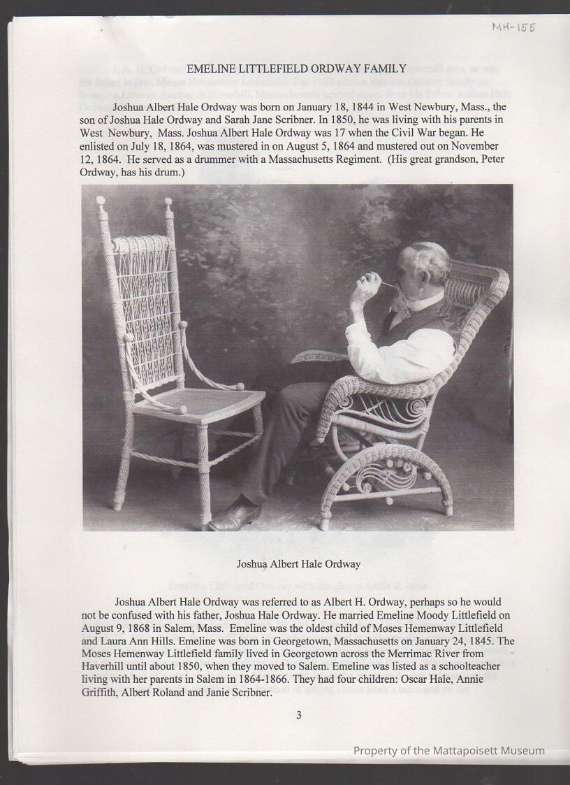 Write-up on Emeline Littlefield Ordway Family (Joshua Albert Hale Ordway). Made chairs.Collection