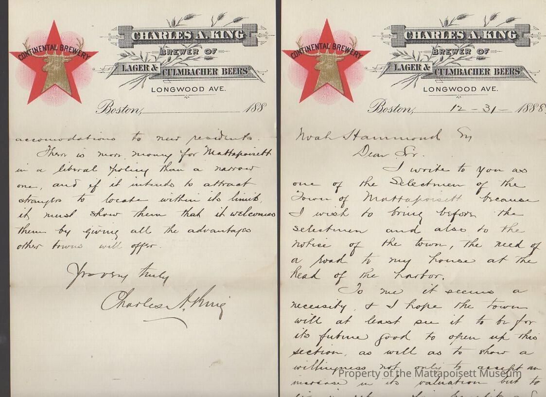 Letter to Noah Hammond, Sr., Selectmen of Mattapoisett, from Charles A. King, requesting to bring before the Selectmen the need for a road (to his house) at the head of the harbor.Collection