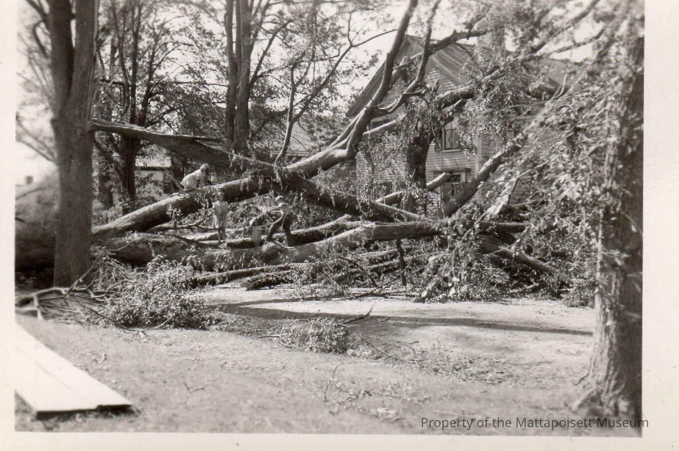 B&W photo showing street and fallen trees in aftermath of storm (possibly 1938 hurricane).Acquisition