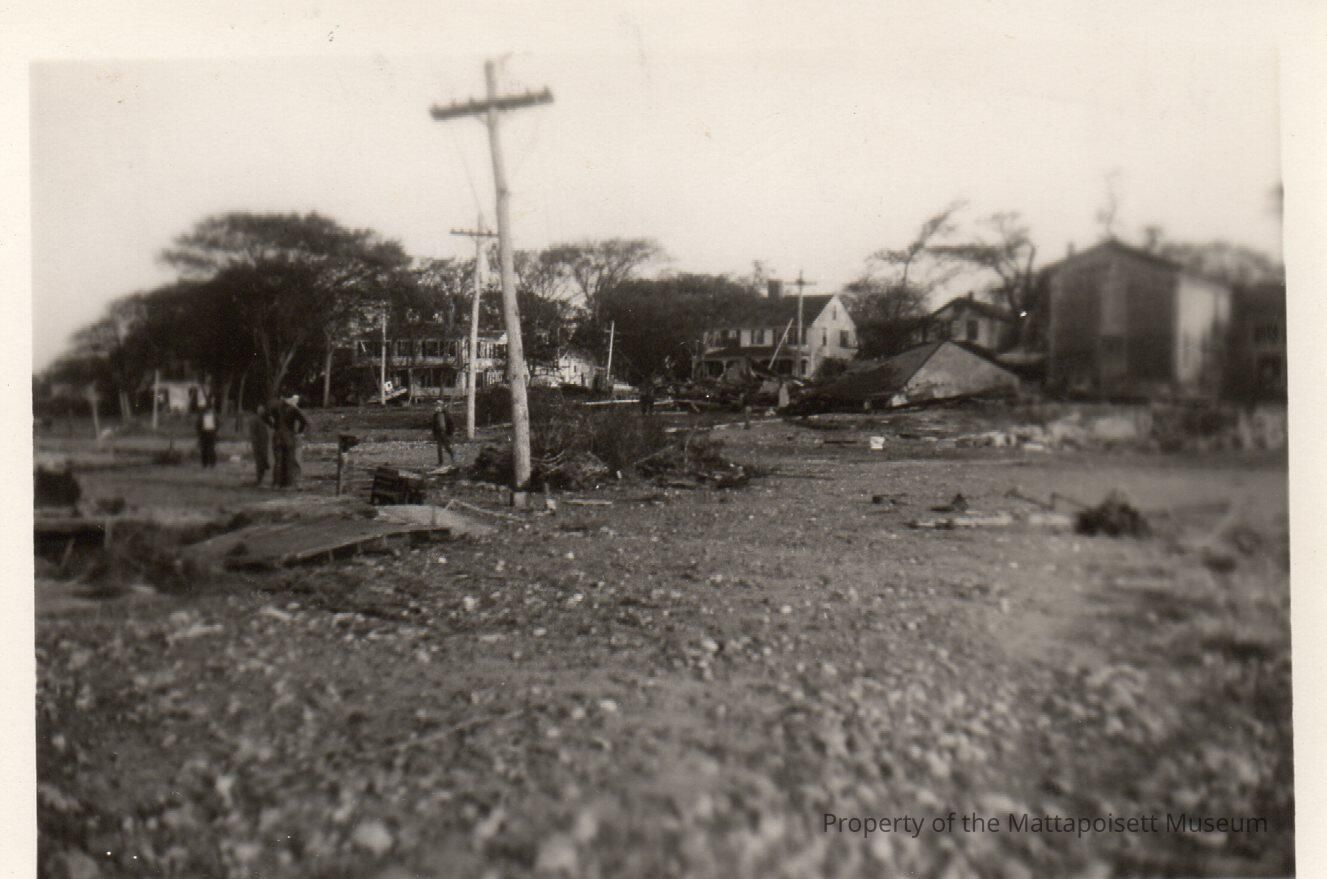 B&W photo showing view of houses and telephone poles in aftermath of 1938 hurricane. Back states: "Hurricane Sept 21 1938, Homestead looking up from wharf".Acquisition