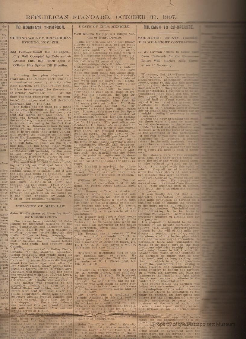 Republican Standard article "Death of Ellis Mendell" Well known Mattapoisett citizen victim of heart diseaseCollection