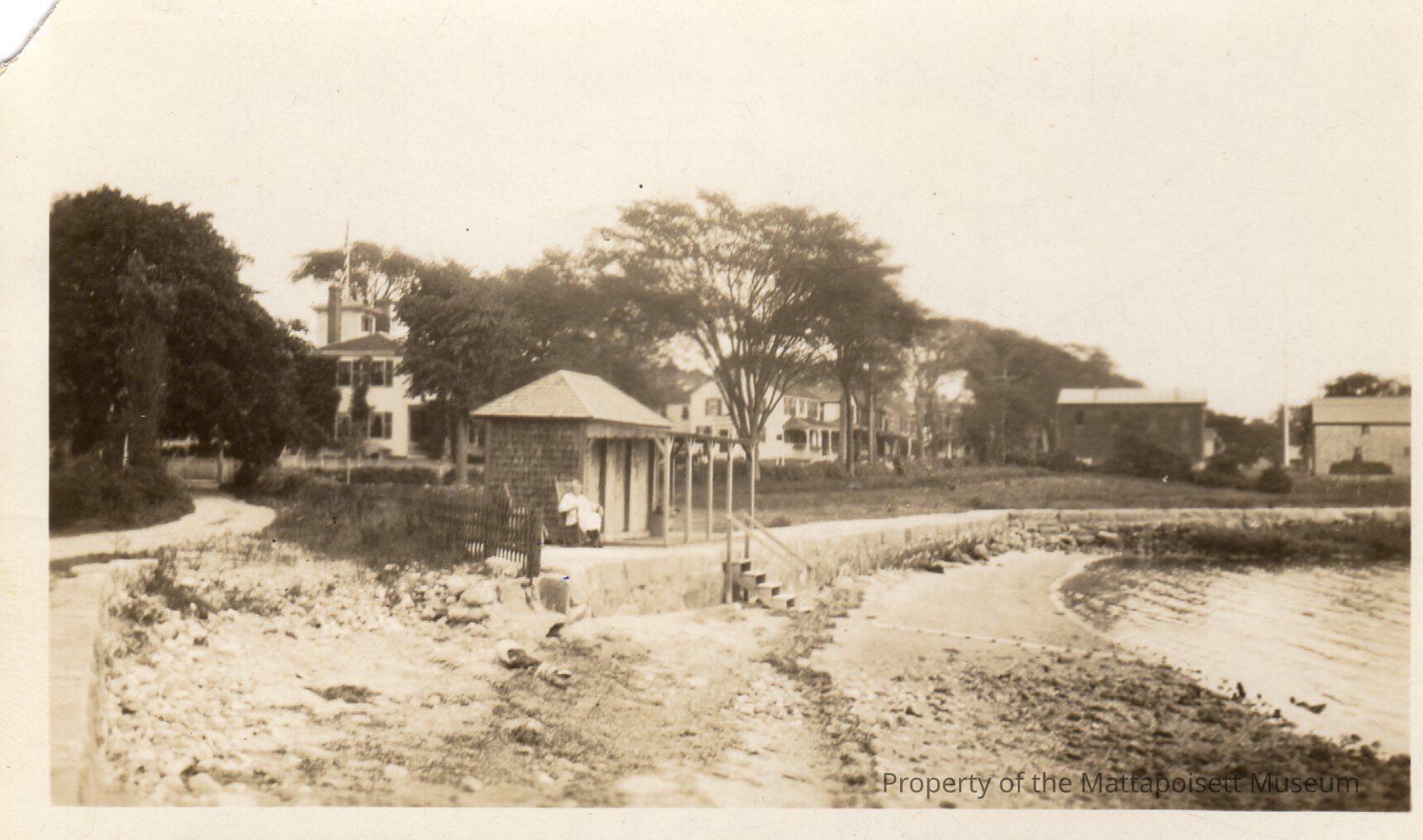 B&W photo showing beach and bath house, with woman sitting in chair. Back states: "The Homestead Bath House, September 26, 1929. Taken by Dorothy".Acquisition