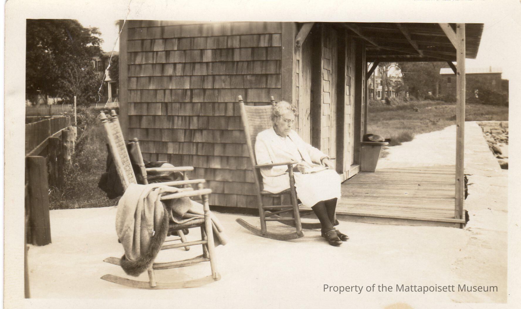 B&W photo showing woman sitting in rocking chair next to bathhouse. Back states: "The Homestead Bath House, September 26, 1929. Taken by Dorothy".Acquisition