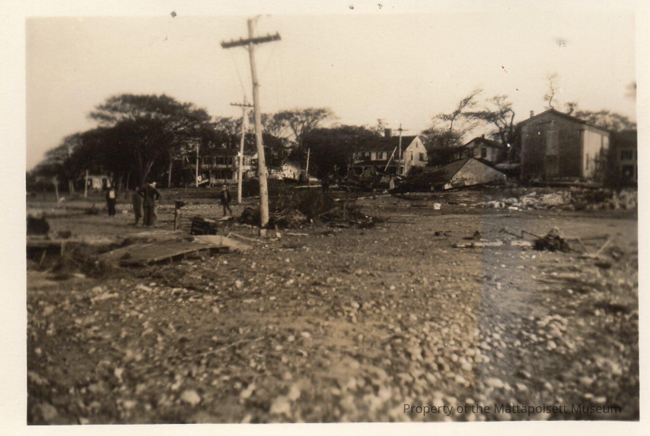 B&W photo showing view of houses and telephone poles in aftermath of 1938 hurricane.