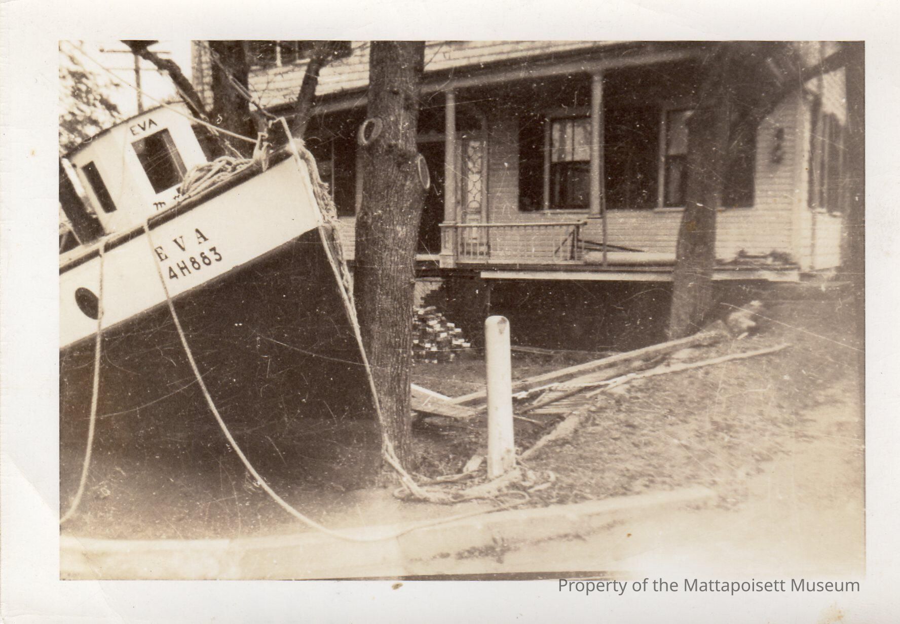 B&W photo showing house and boat in aftermath of 1938 hurricane.Acquisition