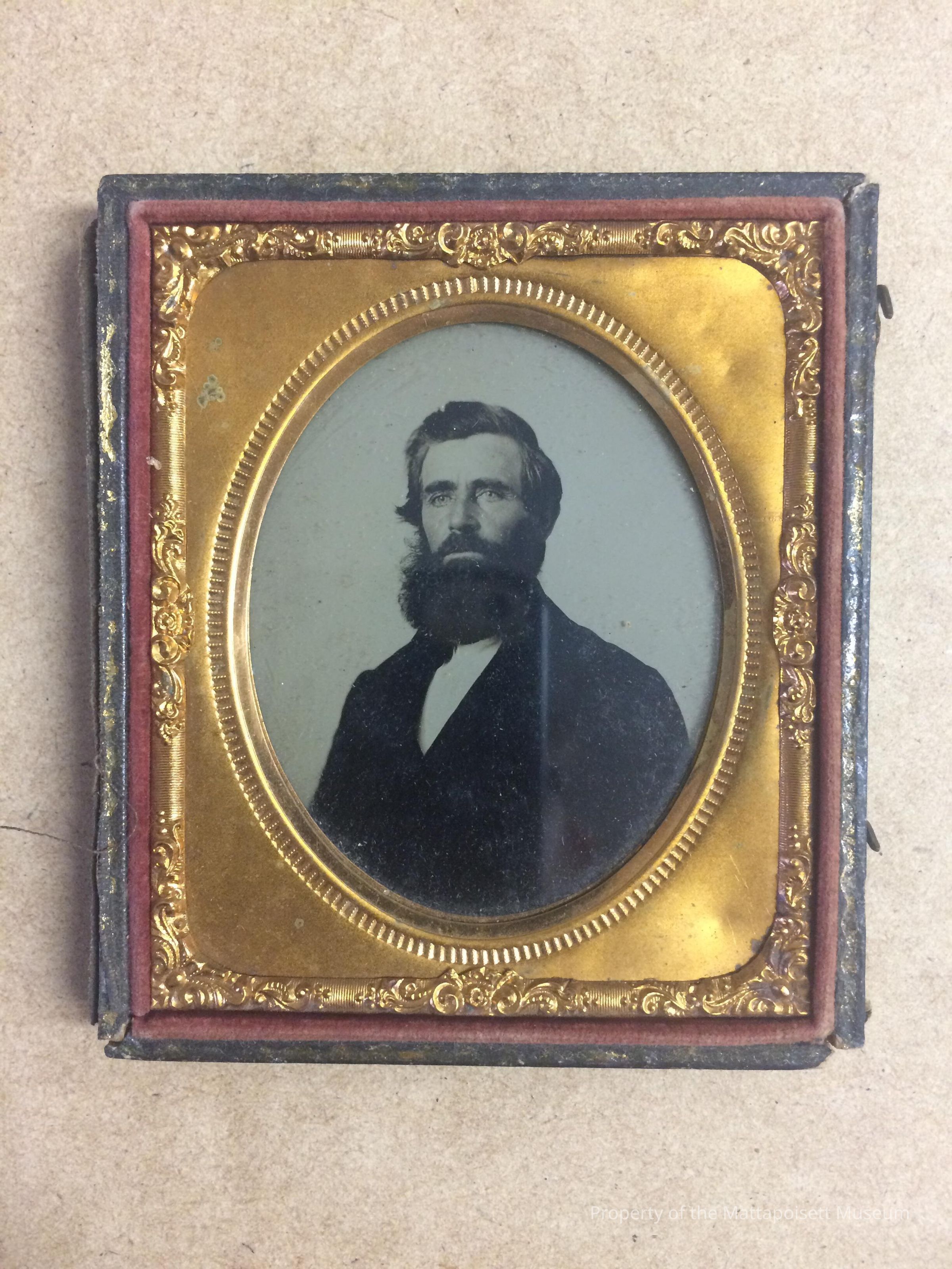 Daguerreotype of a bearded man. Lid detached from case but present. Label pinned to lining identifies photo as Samuel Garlick.