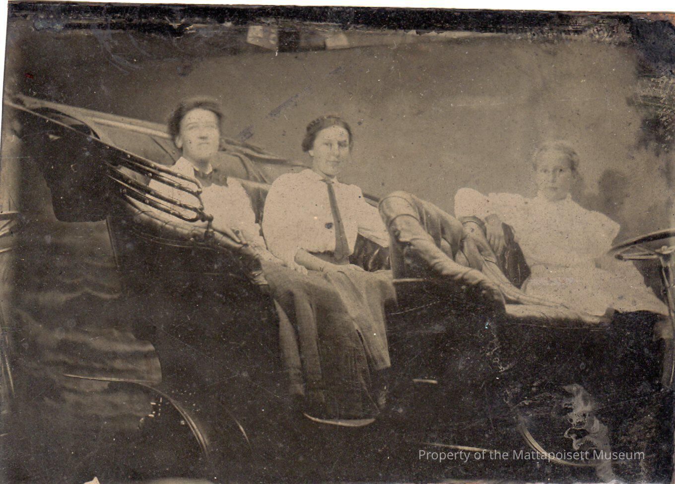 Tintype portrait of three women in a carriage. Unknown subjects.