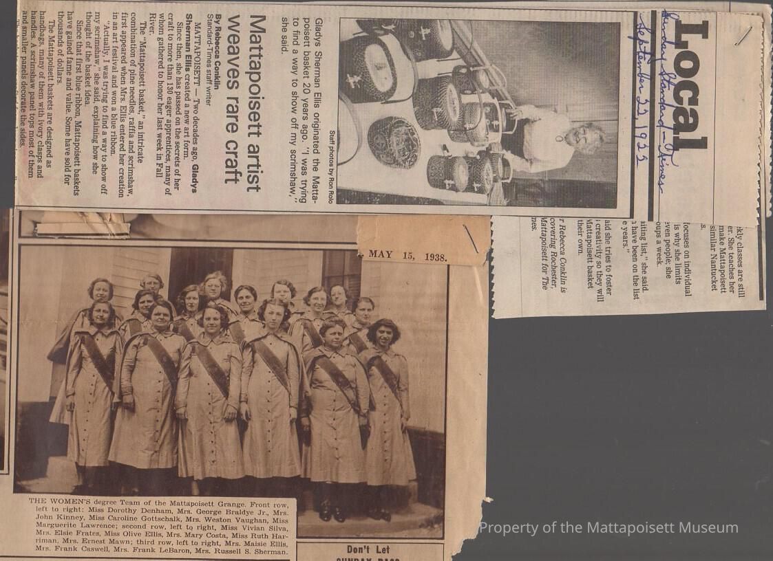 Newspaper articles "Mattapoisett artist weaves rare craft" 09/22/1922, degree Team of the Mattapoisett Grange 05/15/1938.Collection