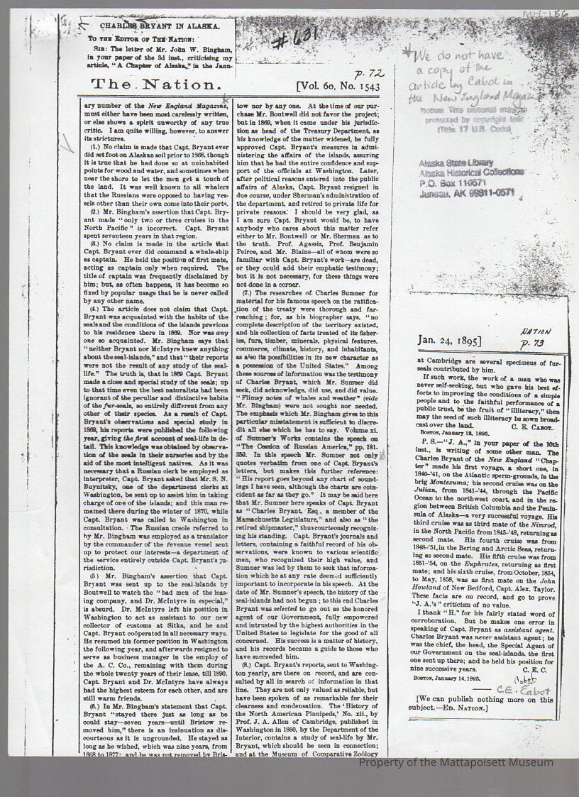 The Nation newspaper, Vol. 60, No. 1543, article "Charles Bryant in Alaska".Collection