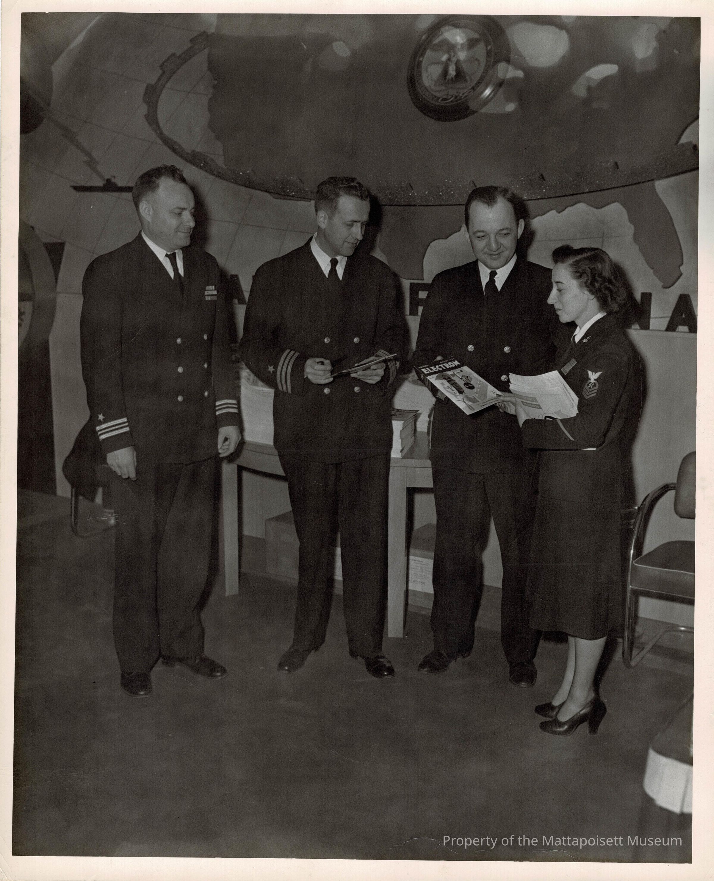 One of a series of B&W photos of Evelyn Pursley (nee Silveira) and various others at what appears to be an event at the US Navy Underwater Sound Laboratory at Fort Trumbull, New London.Acquisition