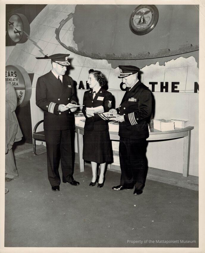 One of a series of B&W photos of Evelyn Pursley (nee Silveira) and various others at what appears to be an event at the US Navy Underwater Sound Laboratory at Fort Trumbull, New London.Acquisition