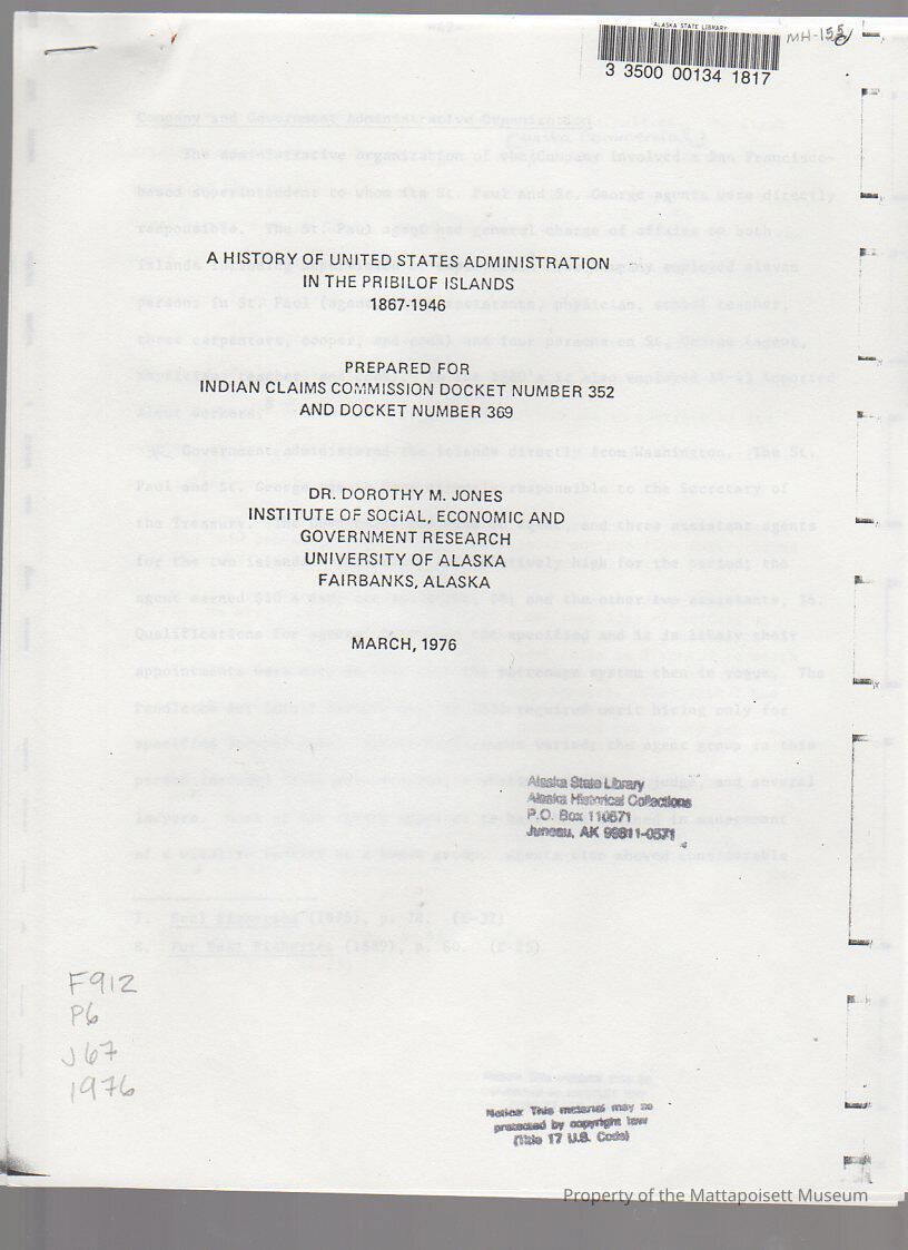 A History of United States Administration in the Pribilof Islands, 1867-1946.Collection