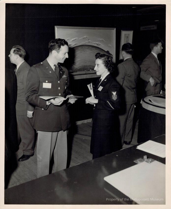 One of a series of B&W photos of Evelyn Pursley (nee Silveira) and various others at what appears to be an event at the US Navy Underwater Sound Laboratory at Fort Trumbull, New London.Acquisition