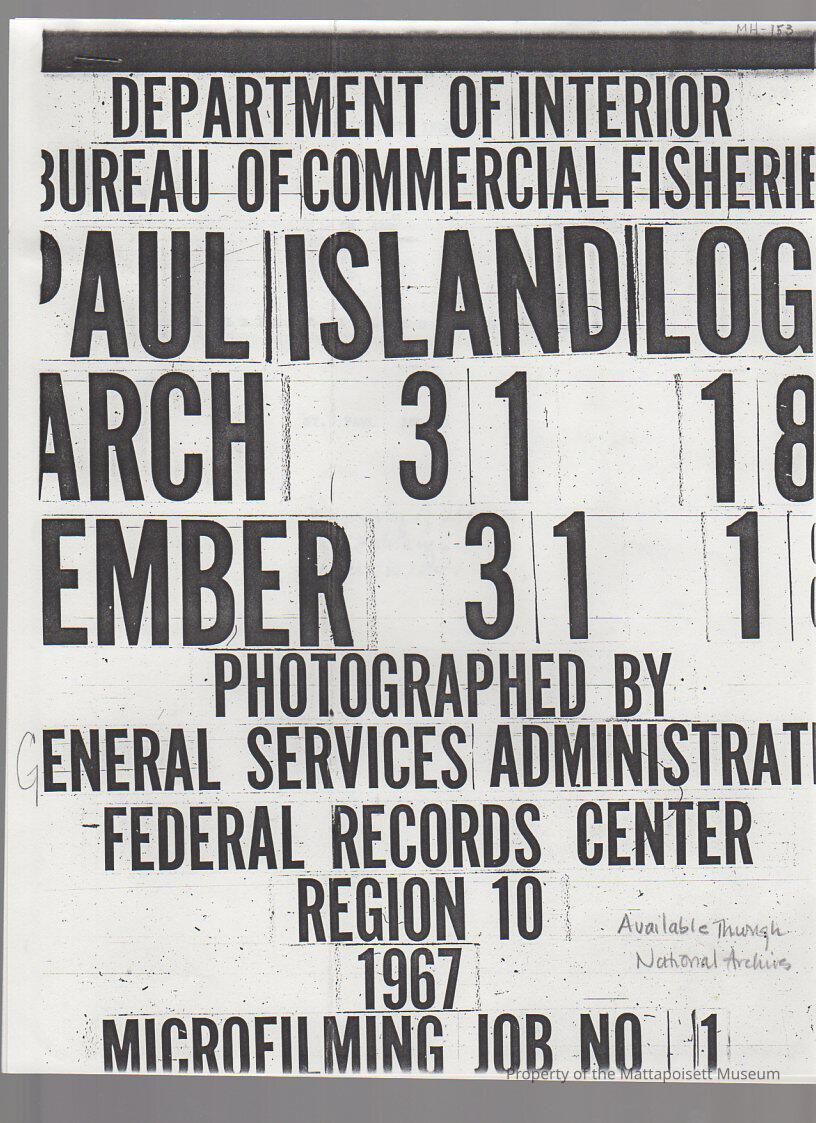 Department of the Interior Bureau of Commercial Fisheries, Paul Island Log, Photographed by General Services Adminsitration, Federal Records Center, Region 10, 1967. (Microfilm title)Collection