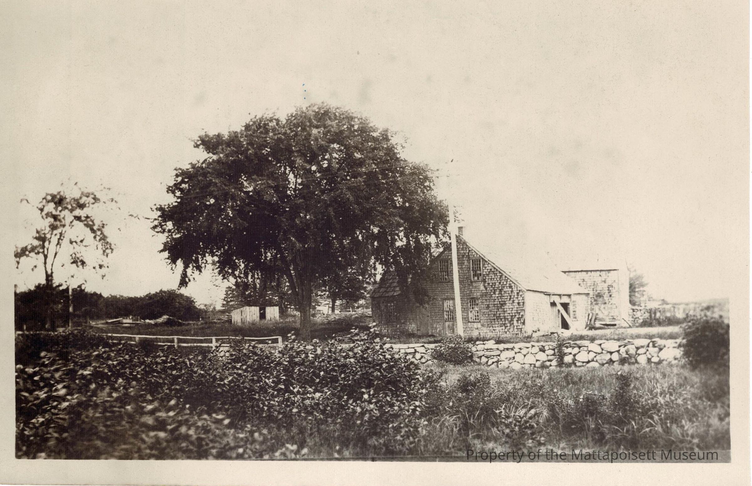 B&W photograph of the Dexter Mill and Dexter Elm. The Dexter Mill was located along Rt. 6, just east of Mendell Road. It was first owned by Elisha Dexter and the large elm tree in front was at one time used to post town notices. The tree was cut down in 1966.Collection