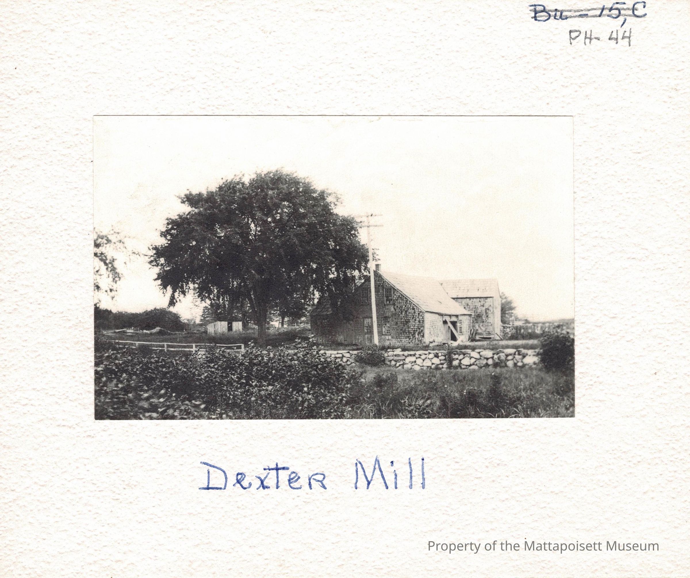B&W photograph of the Dexter Mill and Dexter Elm. The Dexter Mill was located along Rt. 6, just east of Mendell Road. It was first owned by Elisha Dexter and the large elm tree in front was at one time used to post town notices. The tree was cut down in 1966.Collection