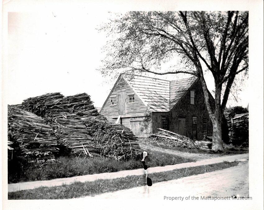 B&W photograph of the Dexter Mill and Dexter Elm. The Dexter Mill was located along Rt. 6, just east of Mendell Road. It was first owned by Elisha Dexter and the large elm tree in front was at one time used to post town notices. The tree was cut down in 1966.Collection