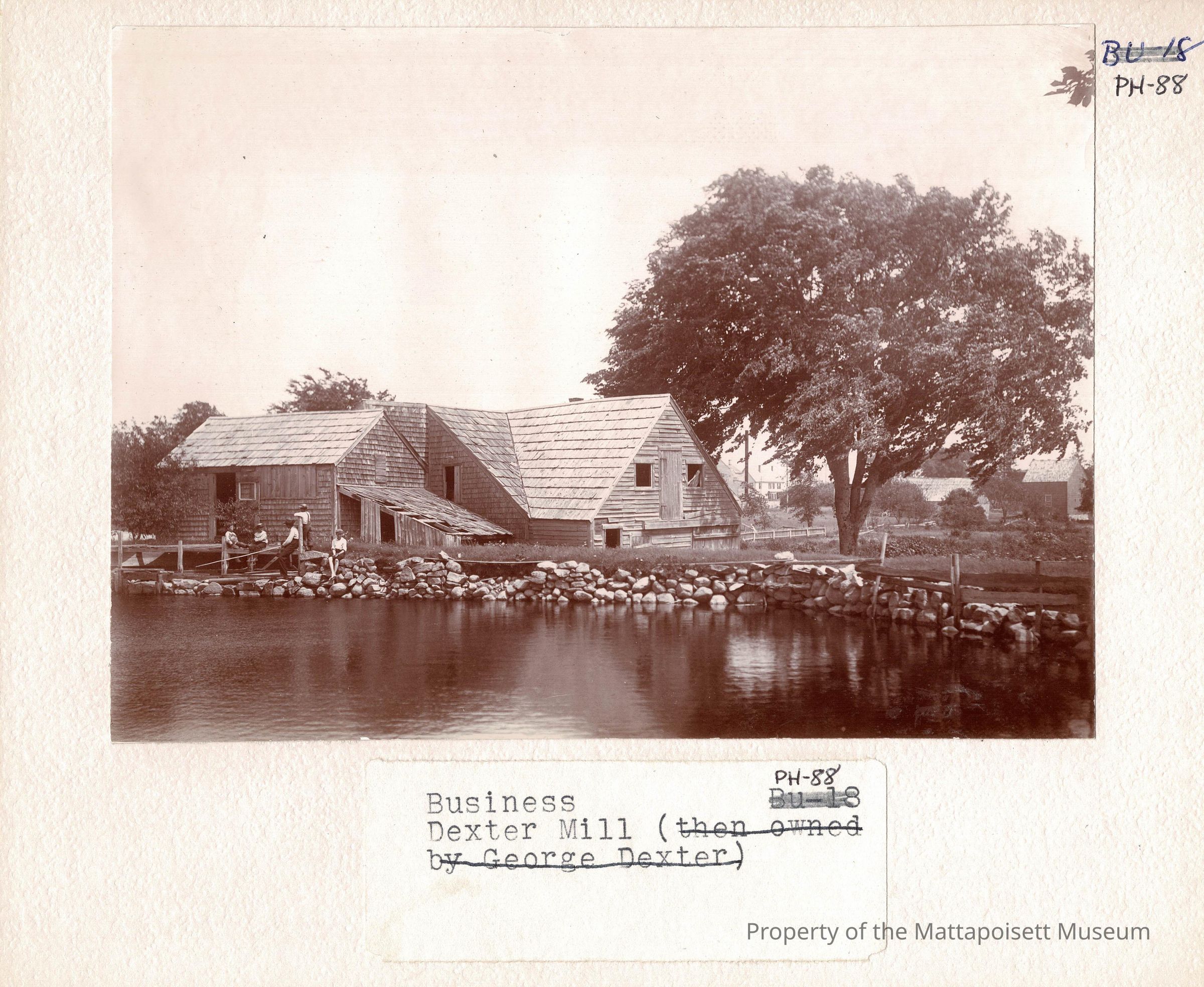 B&W photograph of the Dexter Mill and Dexter Elm. The Dexter Mill was located along Rt. 6, just east of Mendell Road. It was first owned by Elisha Dexter and the large elm tree in front was at one time used to post town notices. The tree was cut down in 1966.Collection