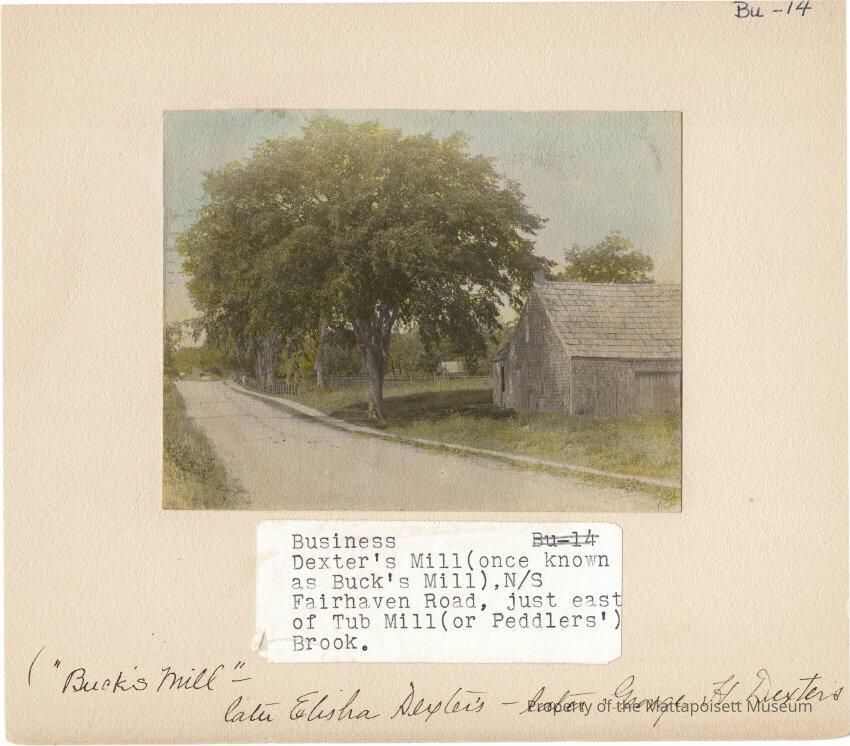 Color print of the Dexter Mill and Dexter Elm. The Dexter Mill was located along Rt. 6, just east of Mendell Road. It was first owned by Elisha Dexter and the large elm tree in front was at one time used to post town notices. The tree was cut down in 1966.Collection
