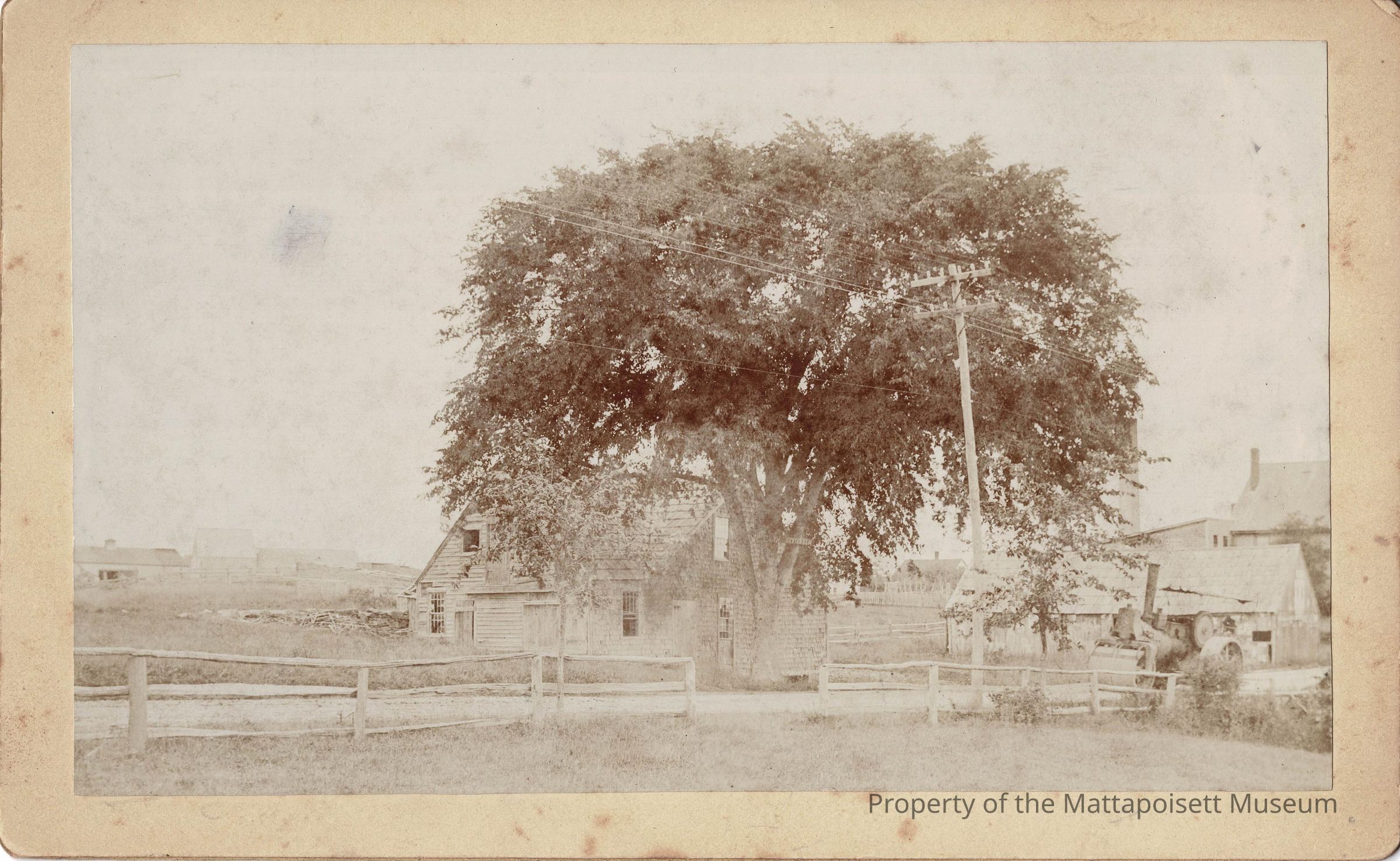 B&W photograph of the Dexter Mill and Dexter Elm. The Dexter Mill was located along Rt. 6, just east of Mendell Road. It was first owned by Elisha Dexter and the large elm tree in front was at one time used to post town notices. The tree was cut down in 1966.Collection