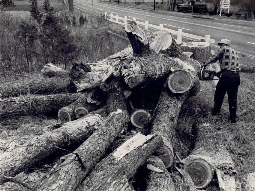 B&W photograph of the Dexter Elm being cut down in December 1966. The man with the chainsaw is Jack Faustino.Collection