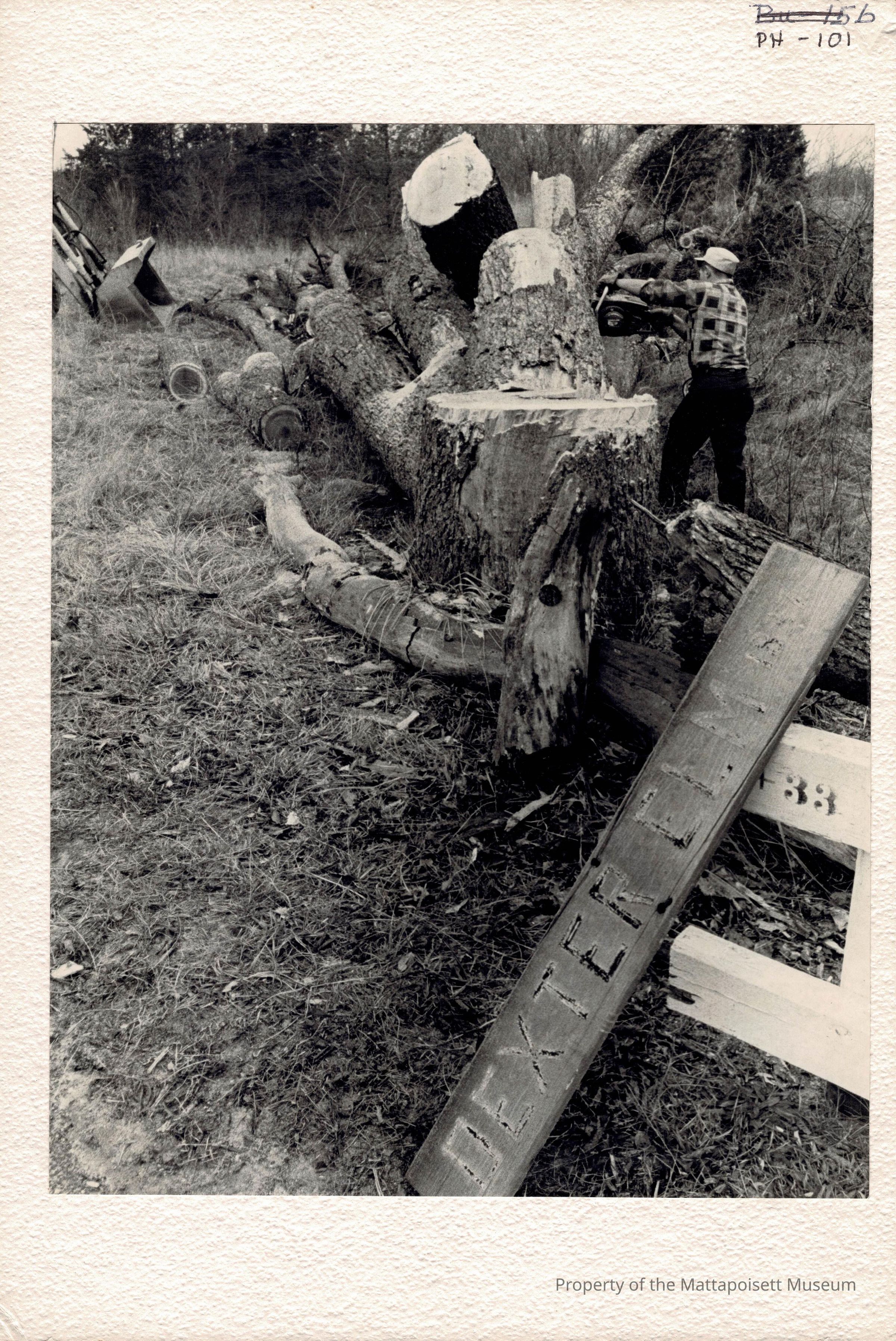 B&W photograph of the Dexter Elm being cut down in December 1966. The man with the chainsaw is Jack Faustino.Collection