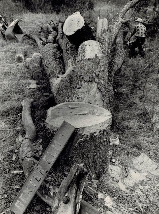 B&W photograph of the Dexter Elm being cut down in December 1966. The man with the chainsaw is Jack Faustino.Collection