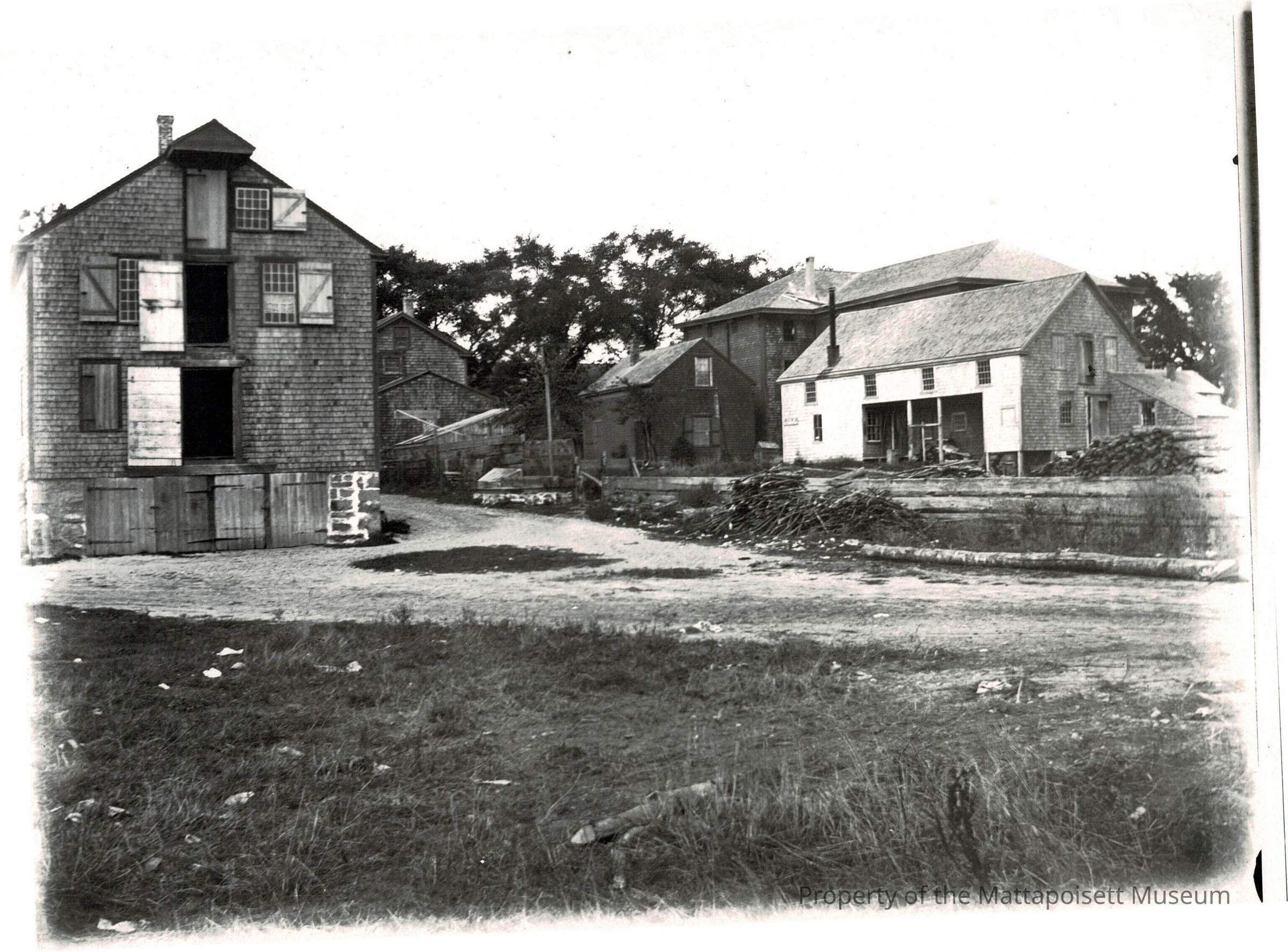 B&W photograph of a group on buildings on Water Street. From left to right: a sail loft, LeBaron's store & steambox, Romeo's, Purrington Hall, and Adison Curtis shop.Collection
